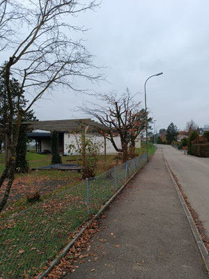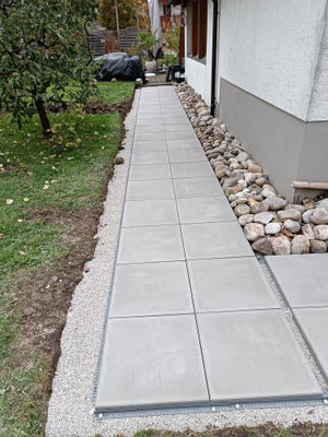 Plattenweg mit Betonplatten grau glatt 50/50/4cm mit Kreuzfugen. Fugenkreuze 3 mm und am Rand mit Steinfix befestigt.