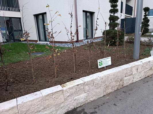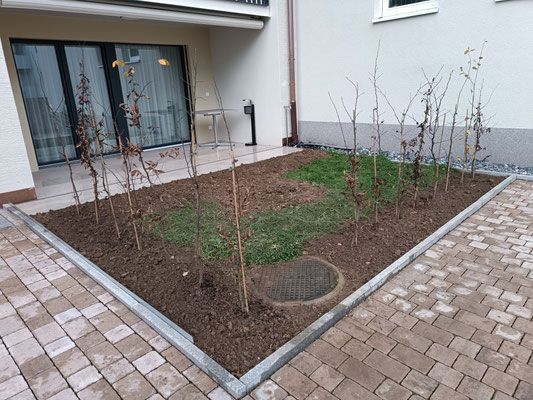 Sitzplatz mit Betonpflastersteine. Eingefasst mit Sträuchern.